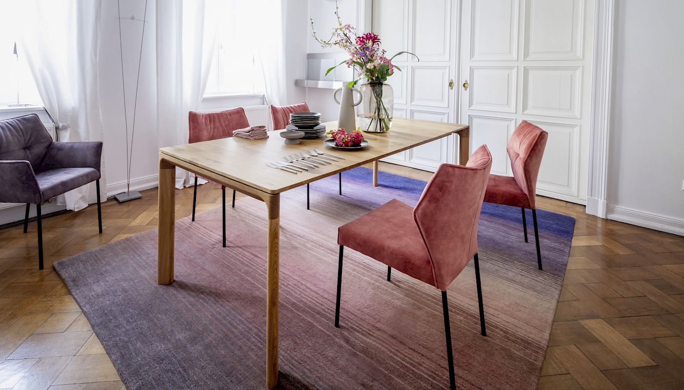 der Eßtisch mit Mittelwange, ohne störende Beine, mit Massivholzplatte in Eiche, Nußbaum oder Buche
